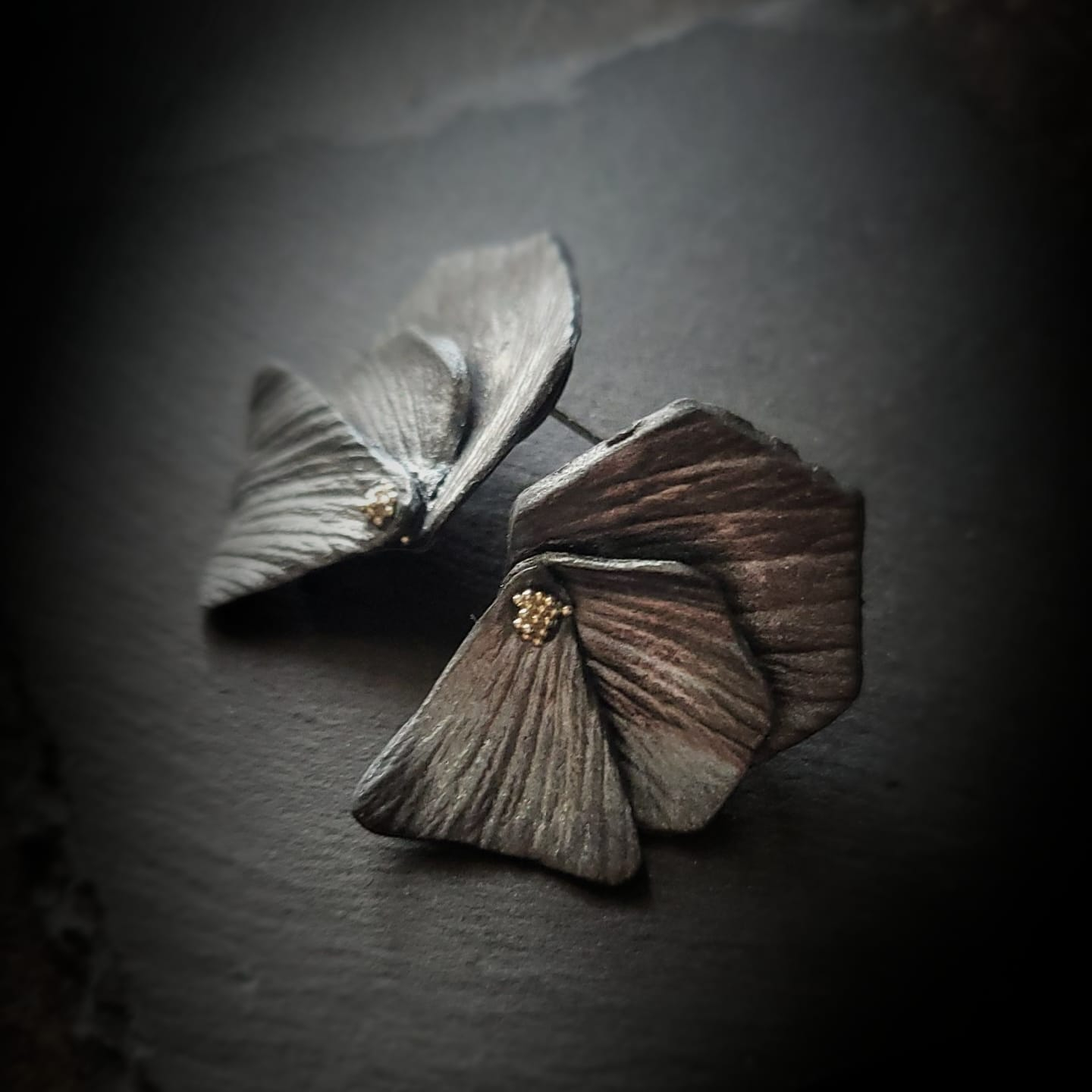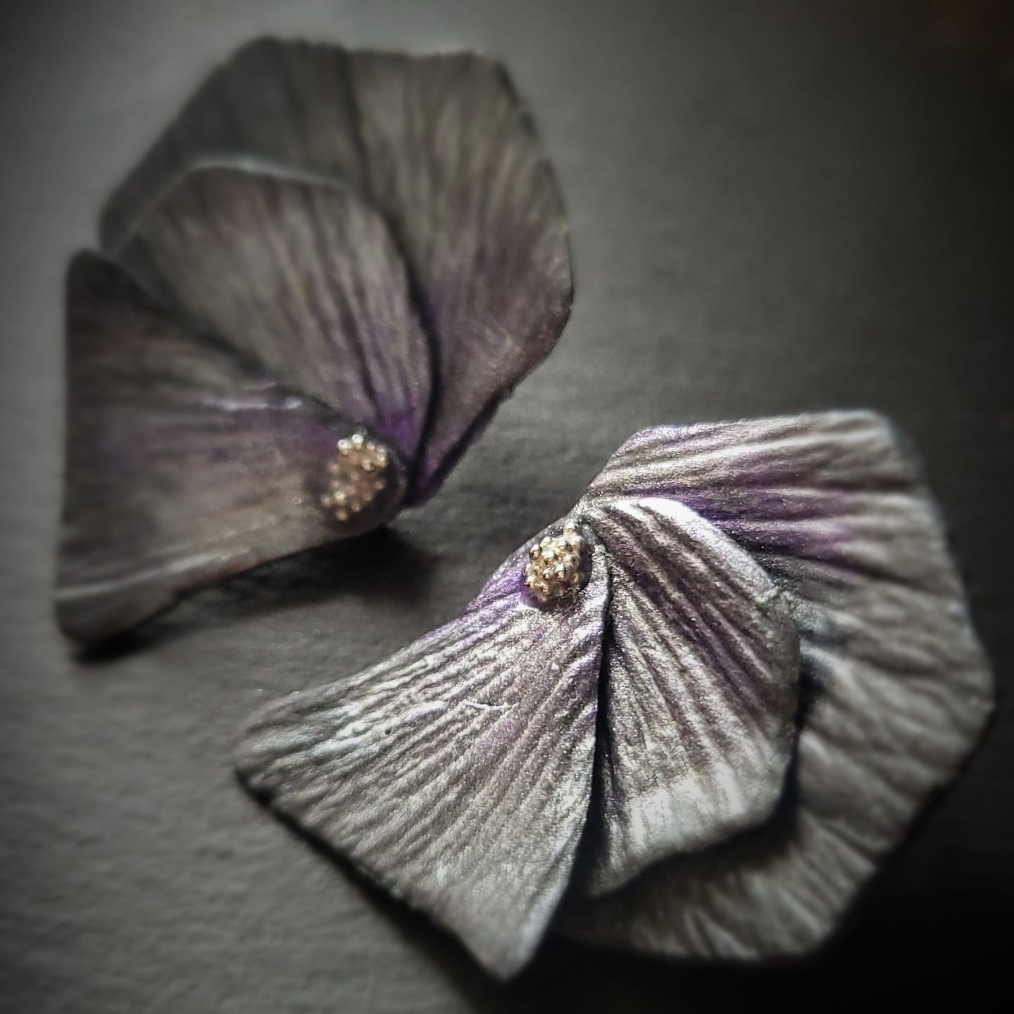 Cercei artizanali realizați și pictați manual din pastă polimerică cu efect metalizat, ce combină nuanțe de gri-argintiu și reflexii subtile de mov-violet.