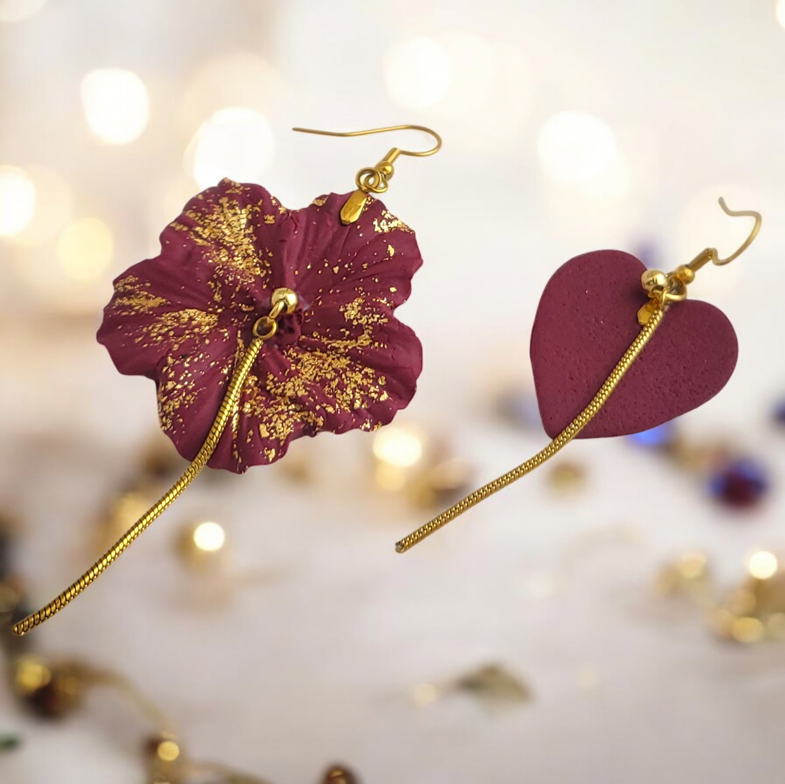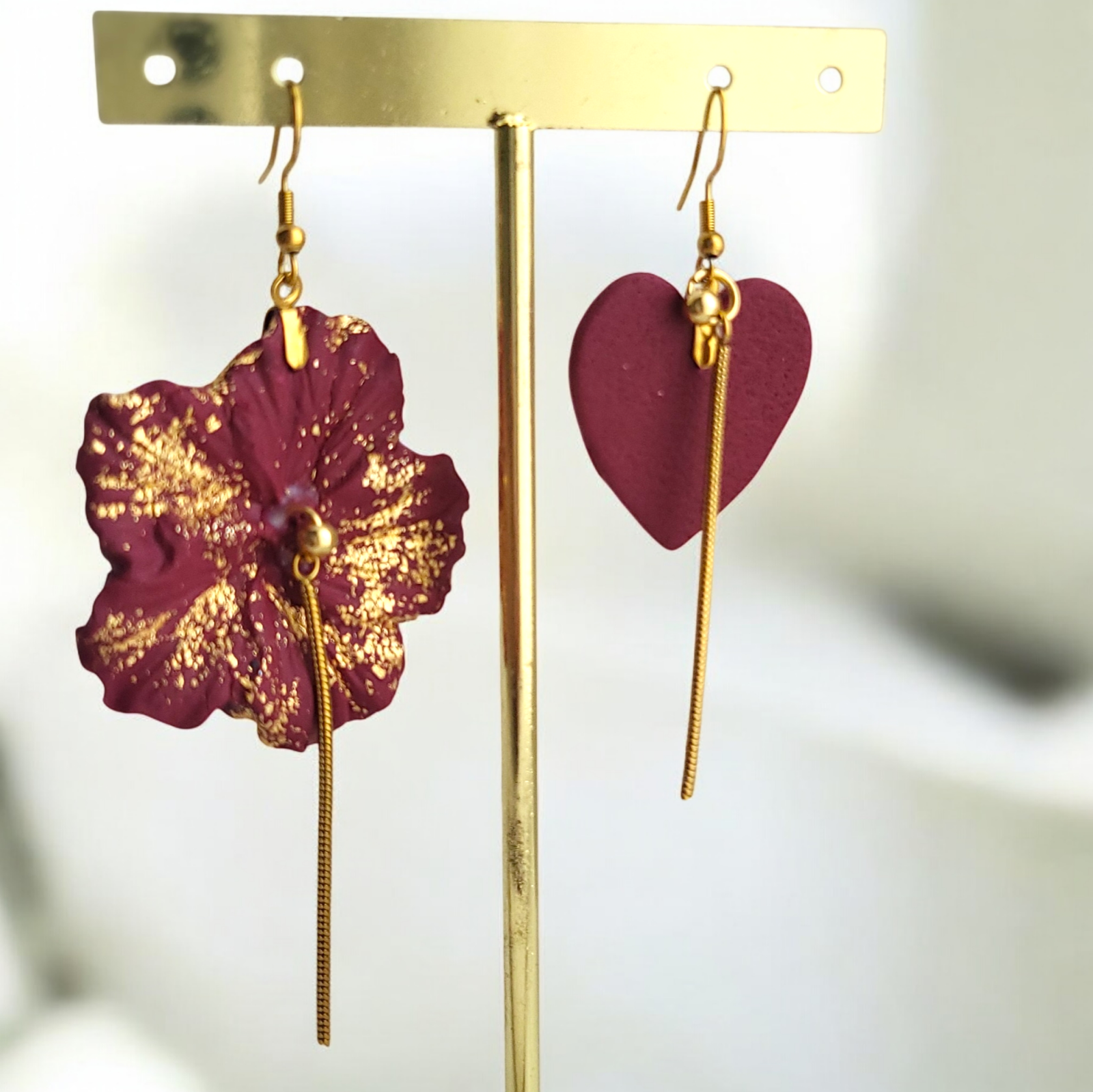 Inspiră-te din frumusețea naturii cu acești cercei handmade în formă de floare grena și inimă grena, modelați manual din lut polimeric și accentuați cu detalii aurii din oțel inoxidabil. Textura delicată a petalelor și nuanța bordo oferă un aer feminin și elegant, perfect pentru a adăuga culoare oricărei ținute.