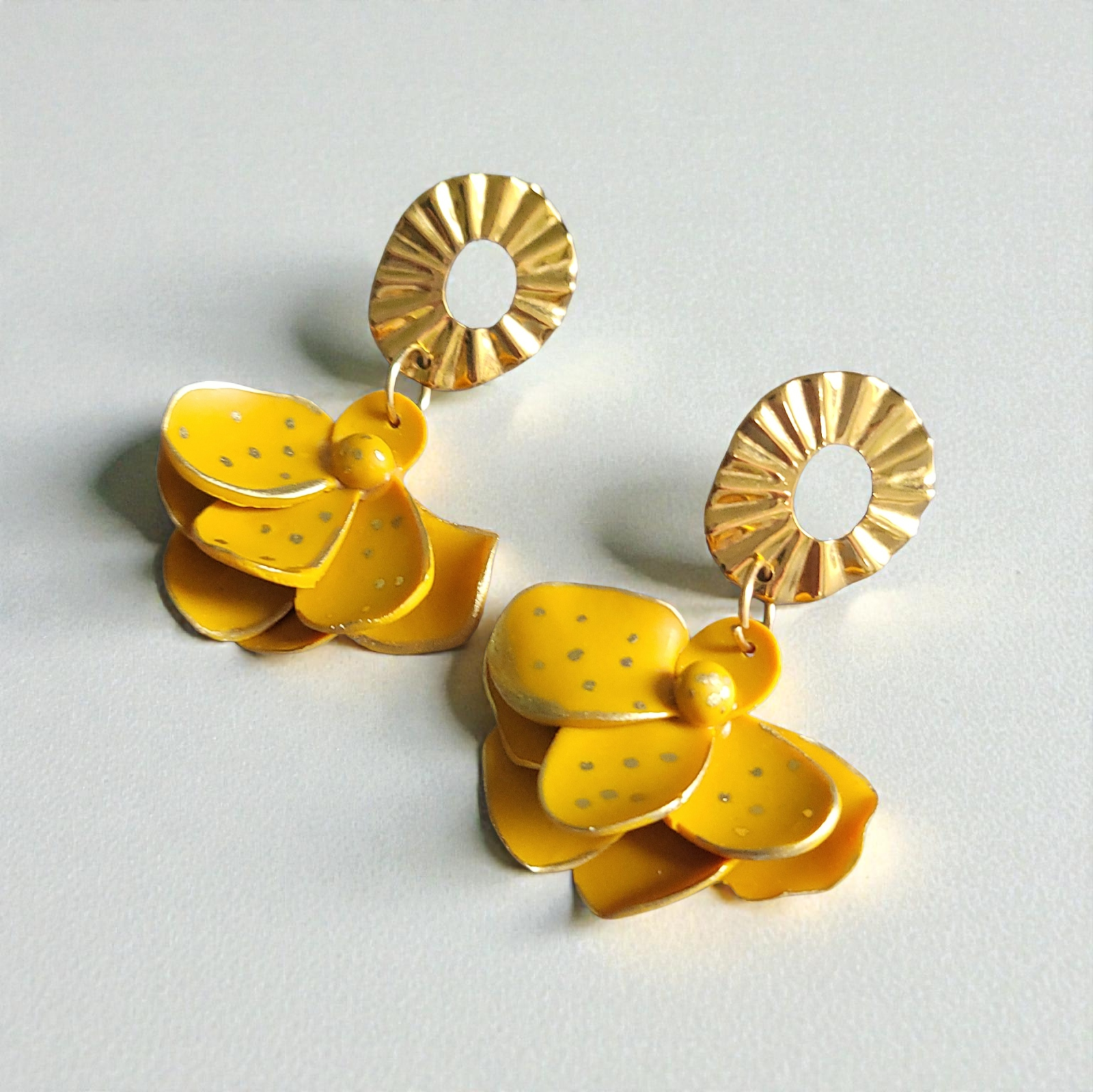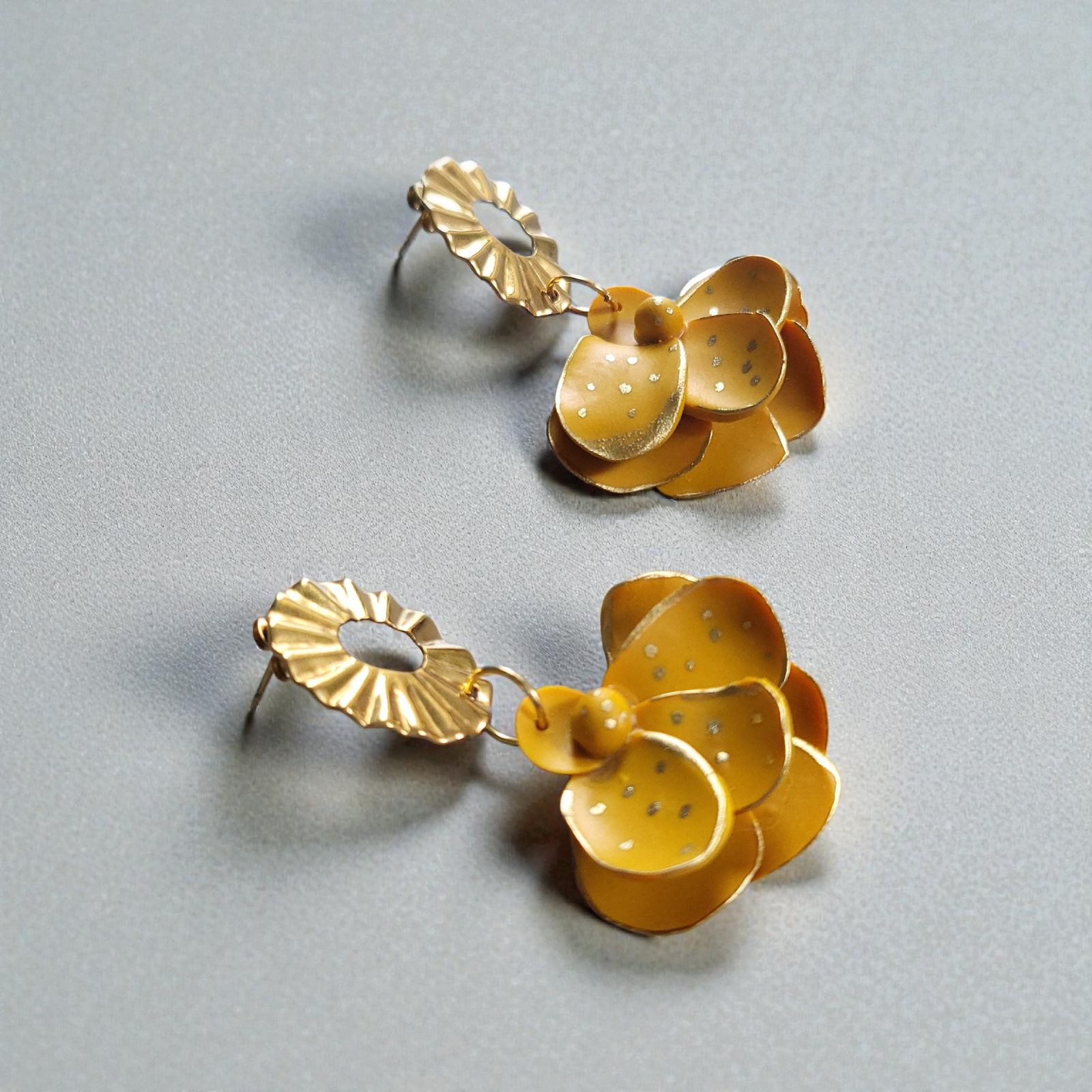 Cercei handmade florali galben-muștar cu accente aurii – ușori, feminini și ideali pentru orice ținută.