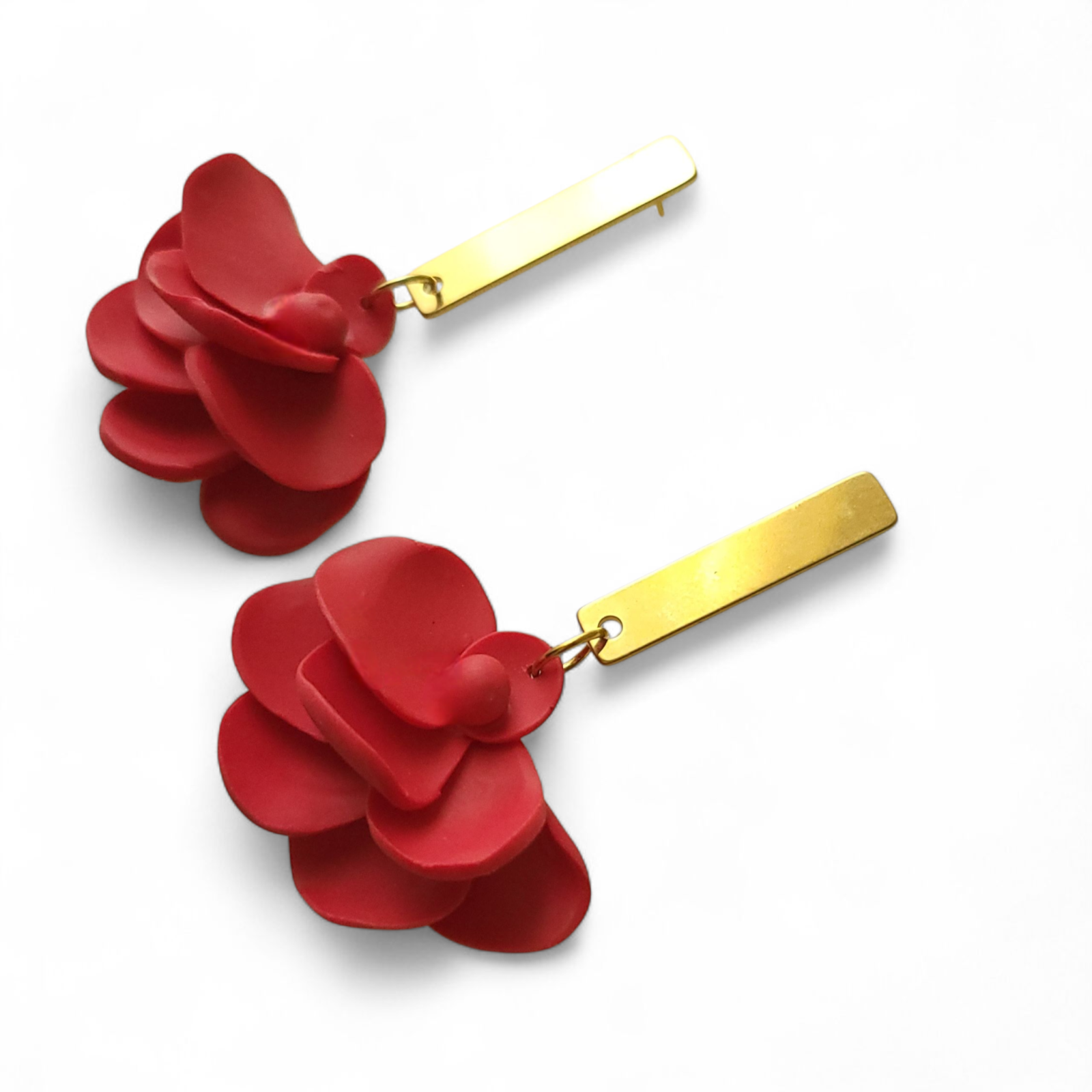 Cercei handmade florali roșii cu accente aurii – ușori, feminini și ideali pentru orice ținută.