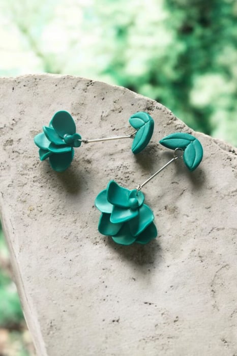 Adaugă un plus de culoare și stil ținutei tale. Sunt creați pentru femeile care iubesc accesoriile unice și moderne. Realizați manual din lut polimeric, acești cercei florali verde smarald impresionează prin forma lor tridimensională și detaliile aurii elegante.