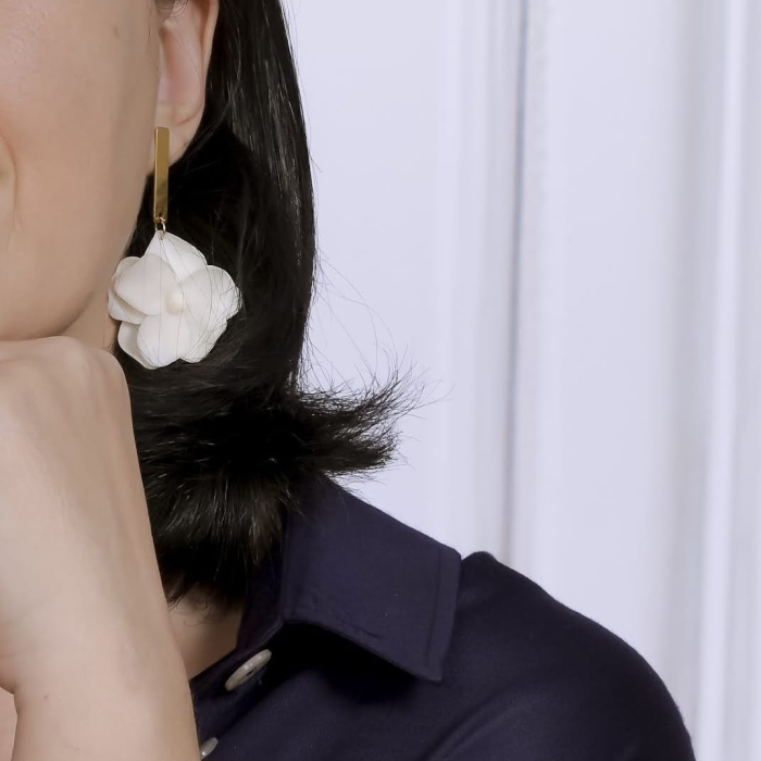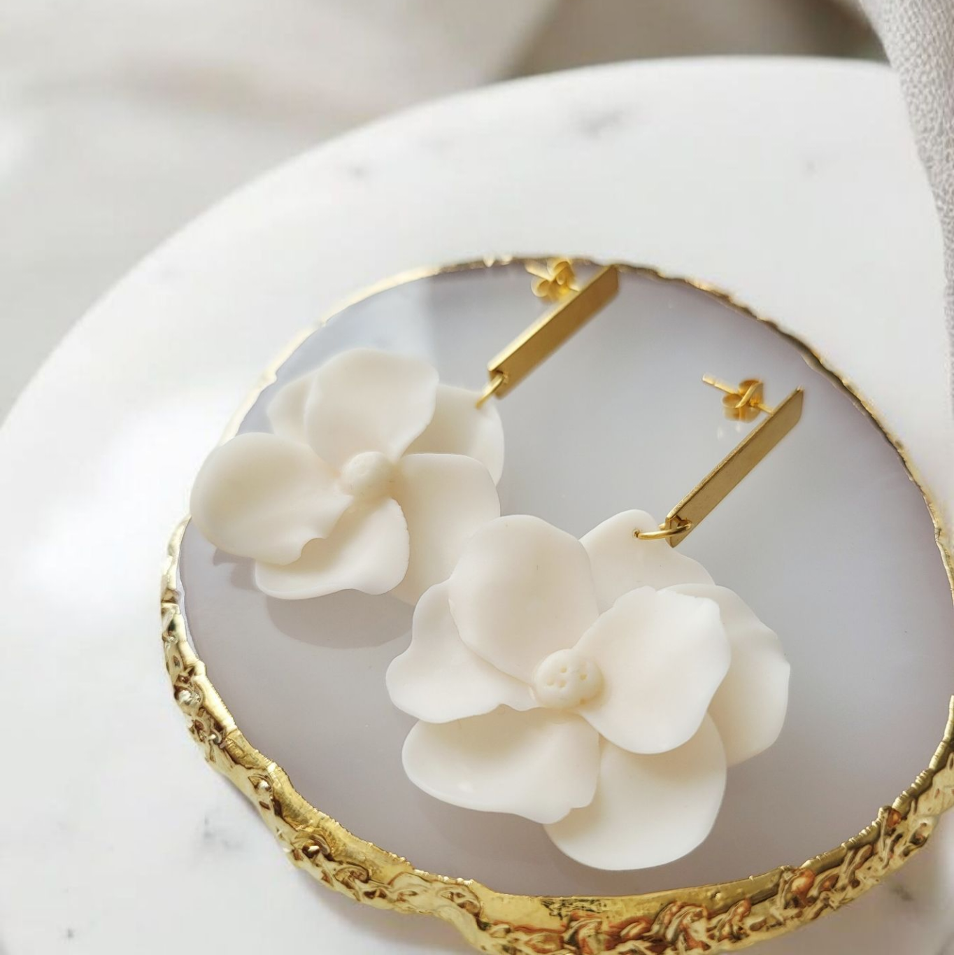 Adaugă un plus de culoare și stil ținutei tale cu cerceii florali, creați pentru femeile care iubesc accesoriile unice și moderne. Realizați manual din lut polimeric, acești cercei florali albi-porțelan impresionează prin forma lor tridimensională și detaliile aurii elegante.