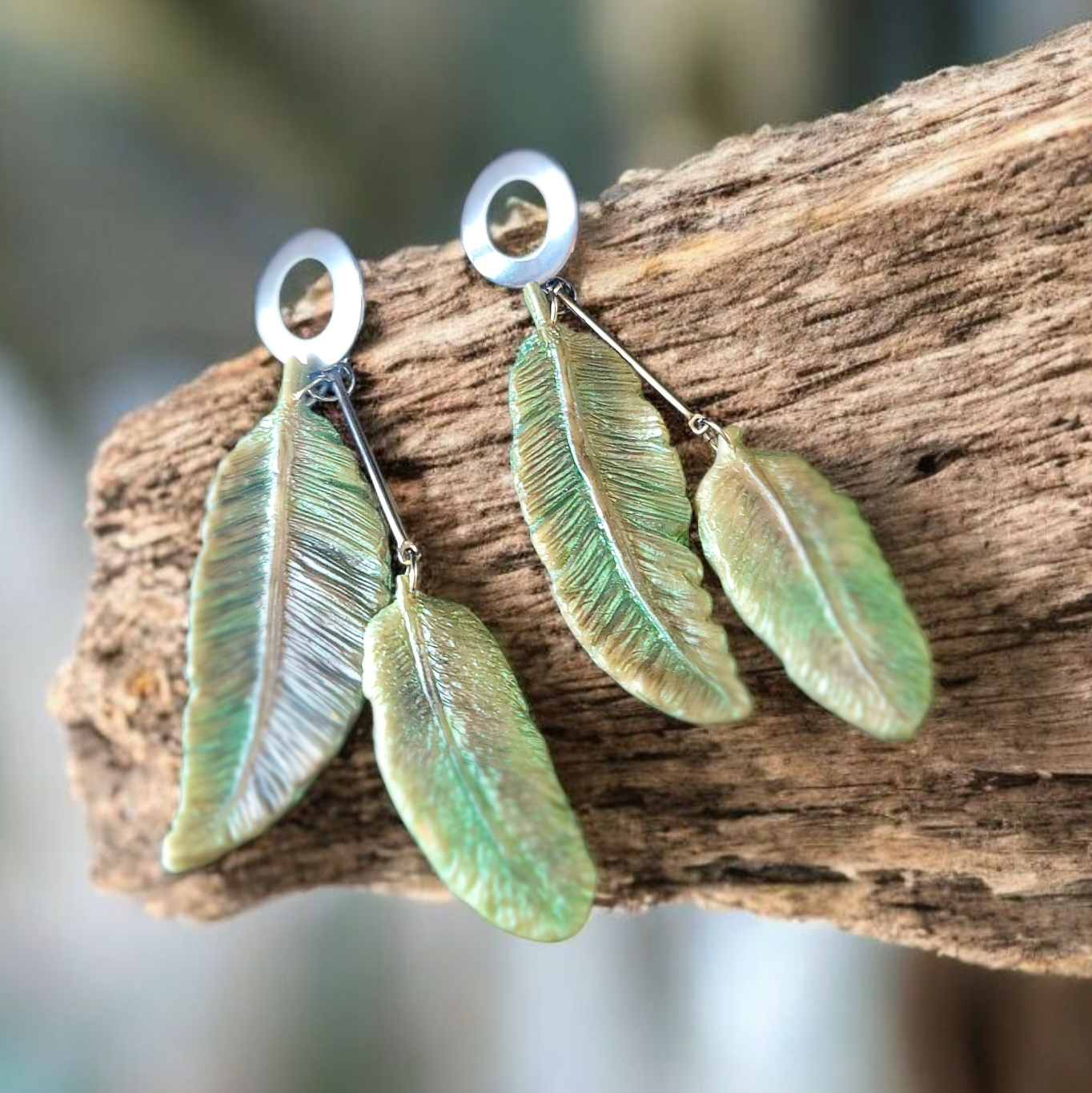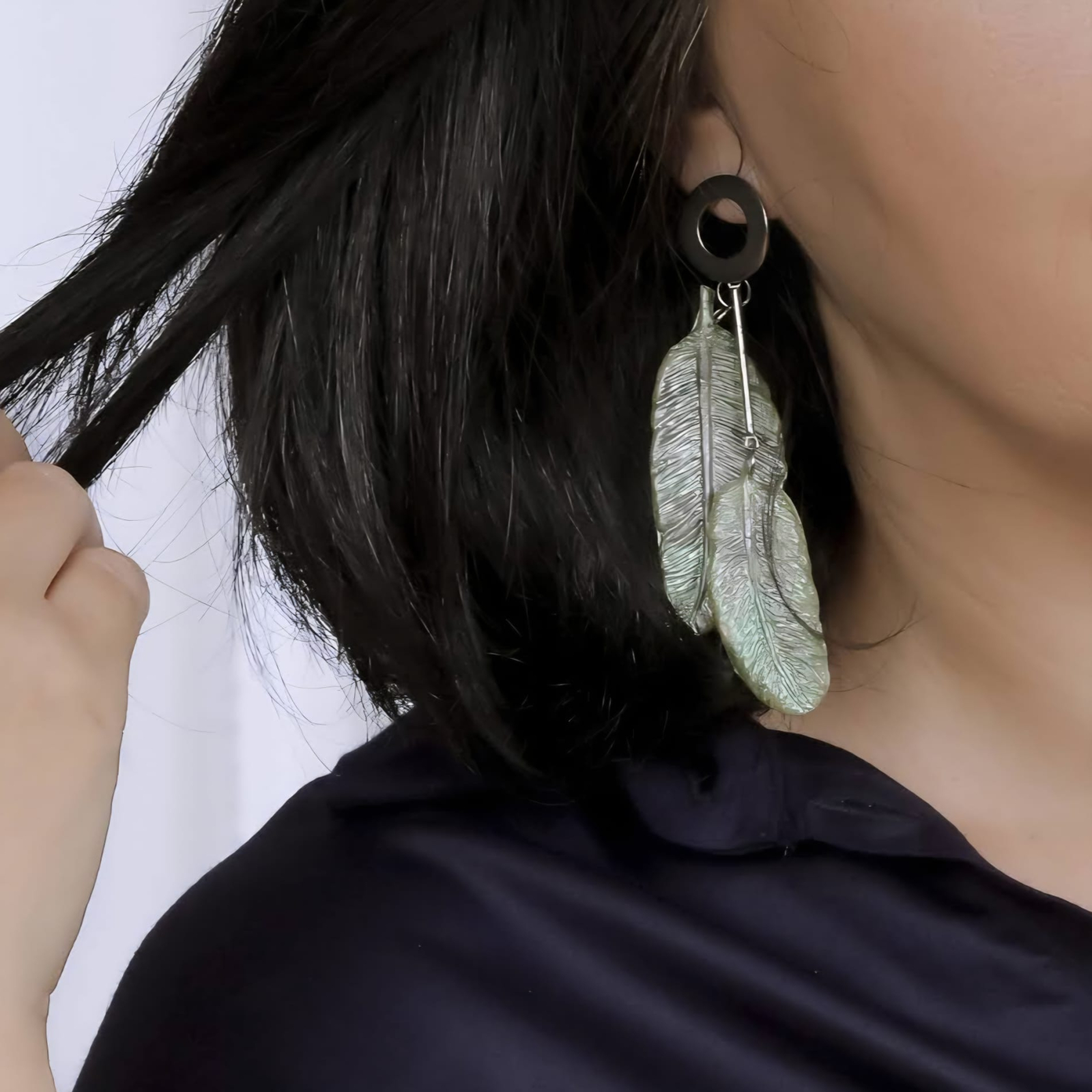 Cerceii „Pene de smarald” sunt realizați manual din lut polimeric, modelați cu finețe pentru a reda forma grațioasă a unei pene.