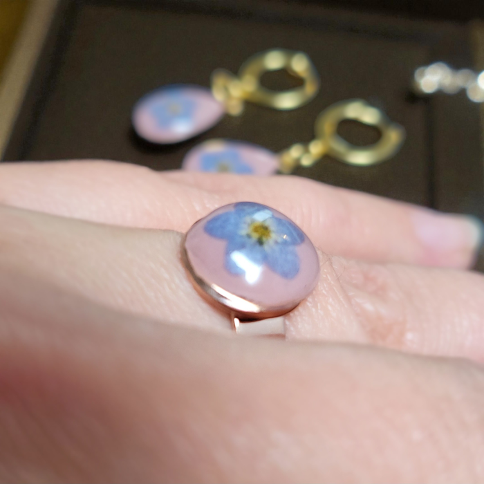 Inel realizat din oțel inoxidabil, cu lut polimeric roz prafuit și floare naturală presată, protejată de un strat de rășină. Designul său delicat îmbină rezistența oțelului cu frumusețea organică a naturii, rezultând un accesoriu feminin, modern și ușor de purtat. Potrivit pentru purtare zilnică sau oferit cadou unei persoane speciale.