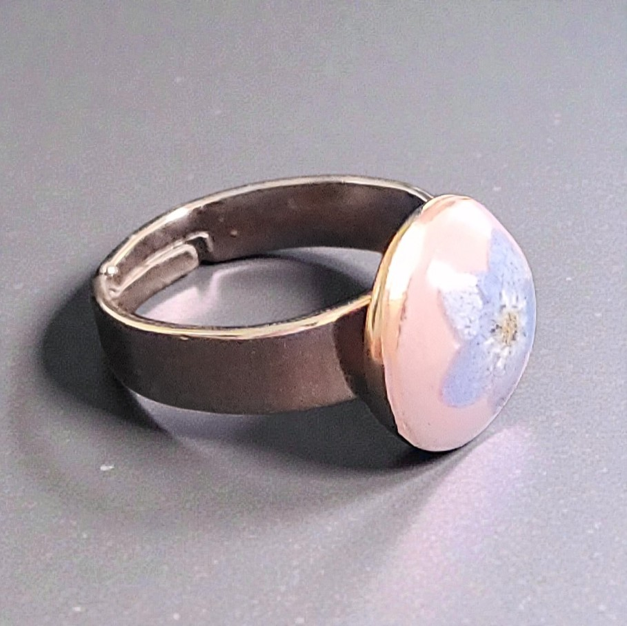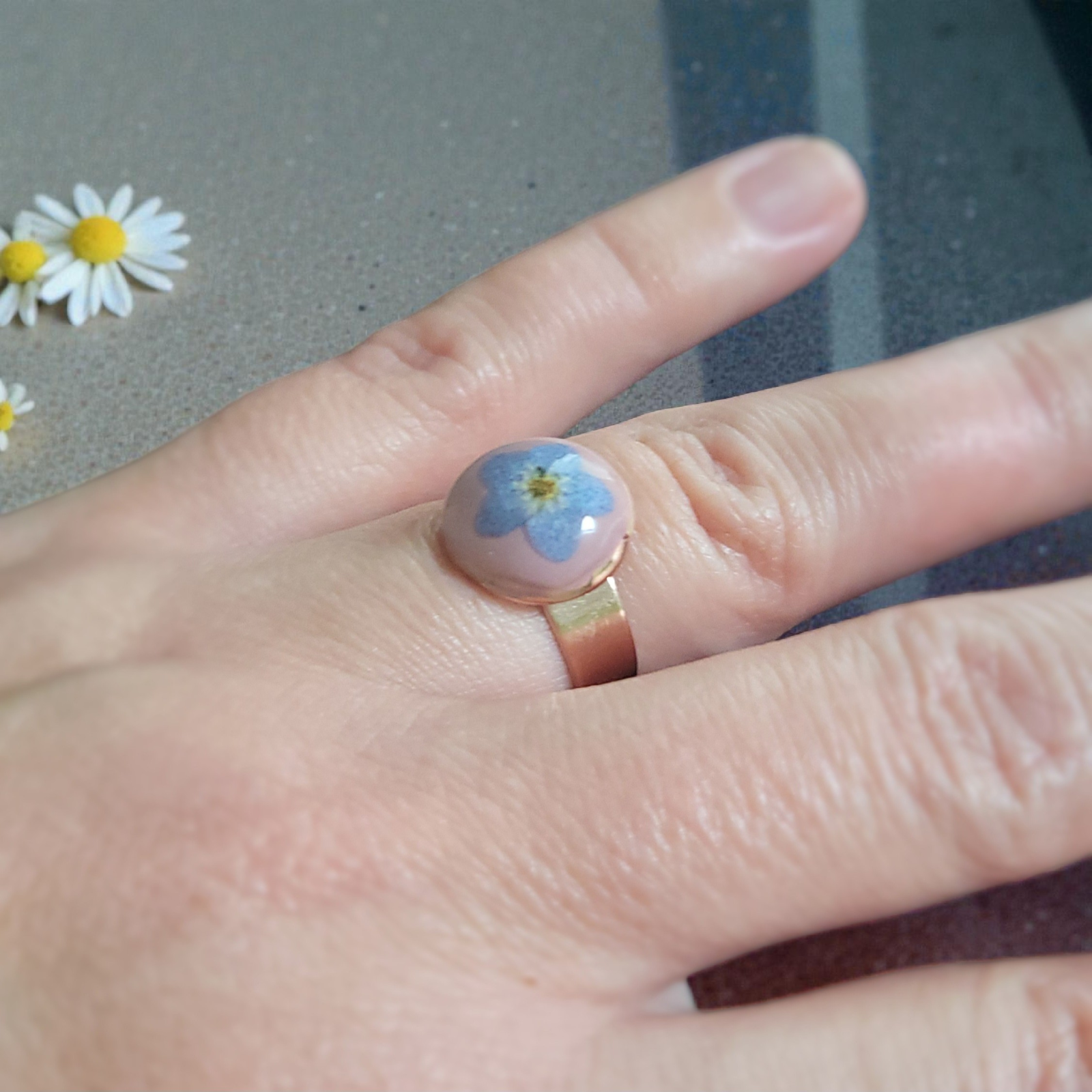 Produs: inel handmade din oțel inoxidabil culoare rose gold, cu lut polimeric roz prafuit și floare naturală presată, protejat cu rășină