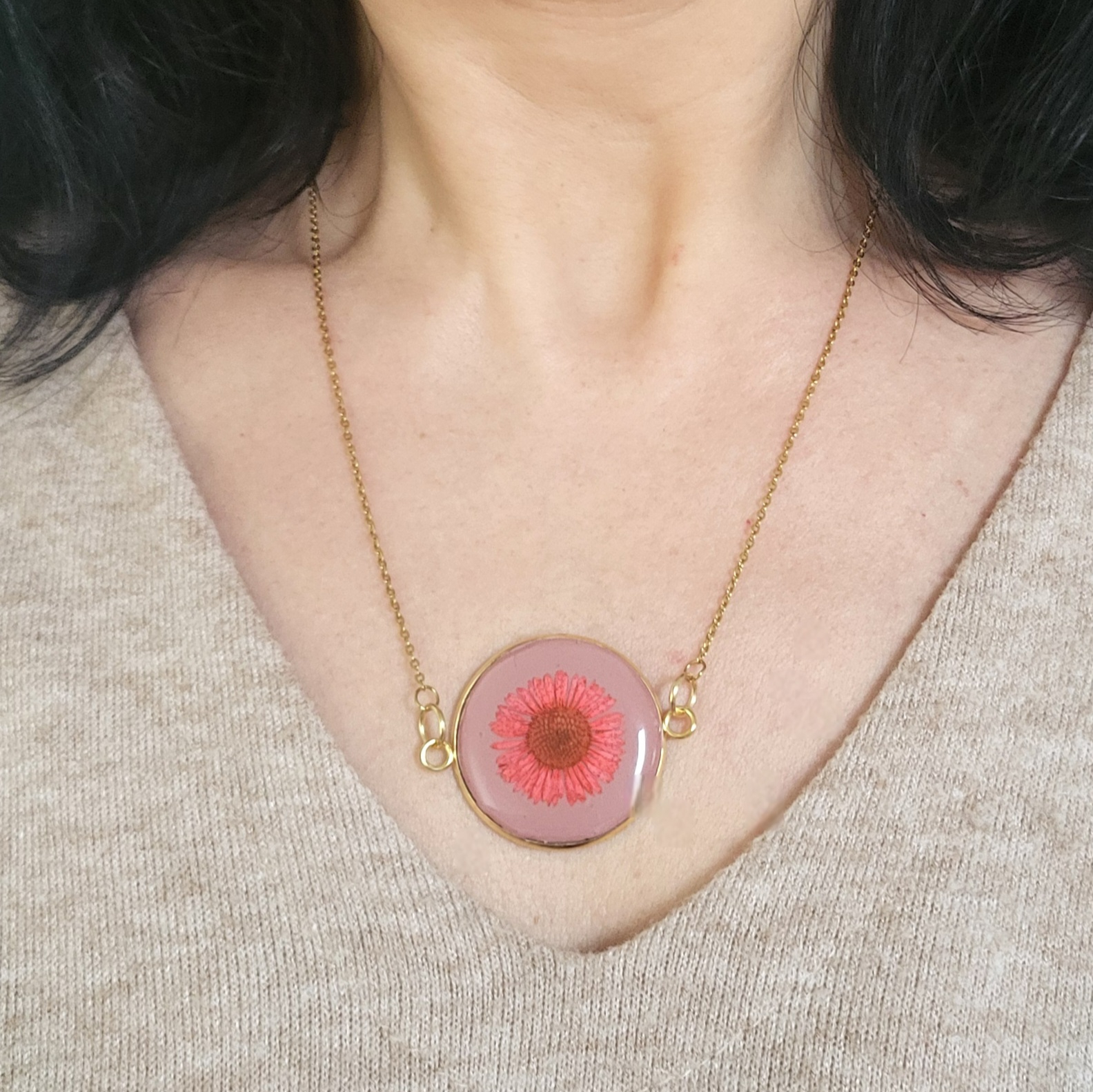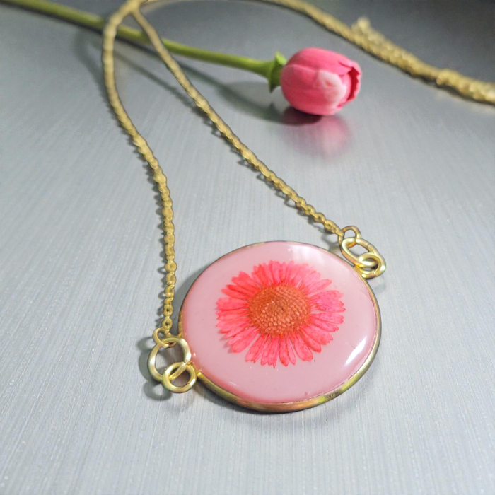 Produs: pandantiv handmade din oțel inoxidabil cu lut polimeric și floare naturală presată, protejat cu rășină