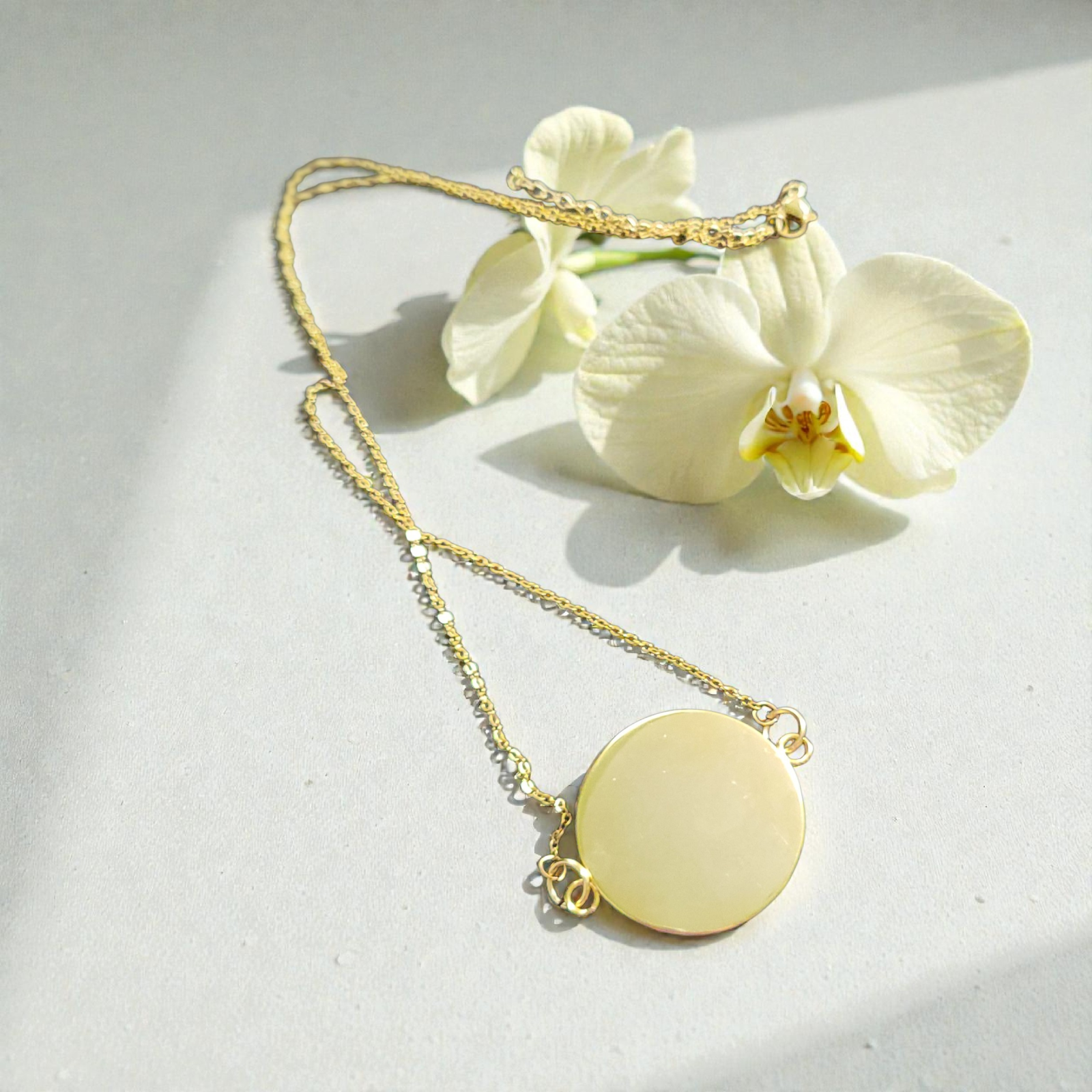 Pandantiv realizat din oțel inoxidabil, lut polimeric și floare naturală presată, protejată de un strat de rășină, prins pe lant din otel inixidabil. Designul său delicat îmbină rezistența oțelului cu frumusețea organică a naturii, rezultând un accesoriu feminin, modern și ușor de purtat. Potrivit pentru purtare zilnică sau oferit cadou unei persoane speciale.