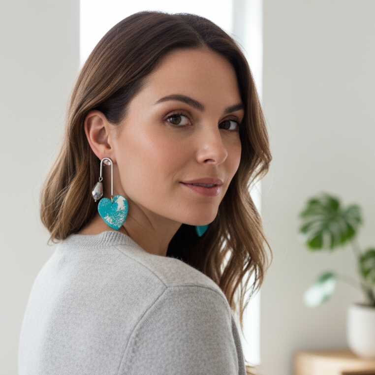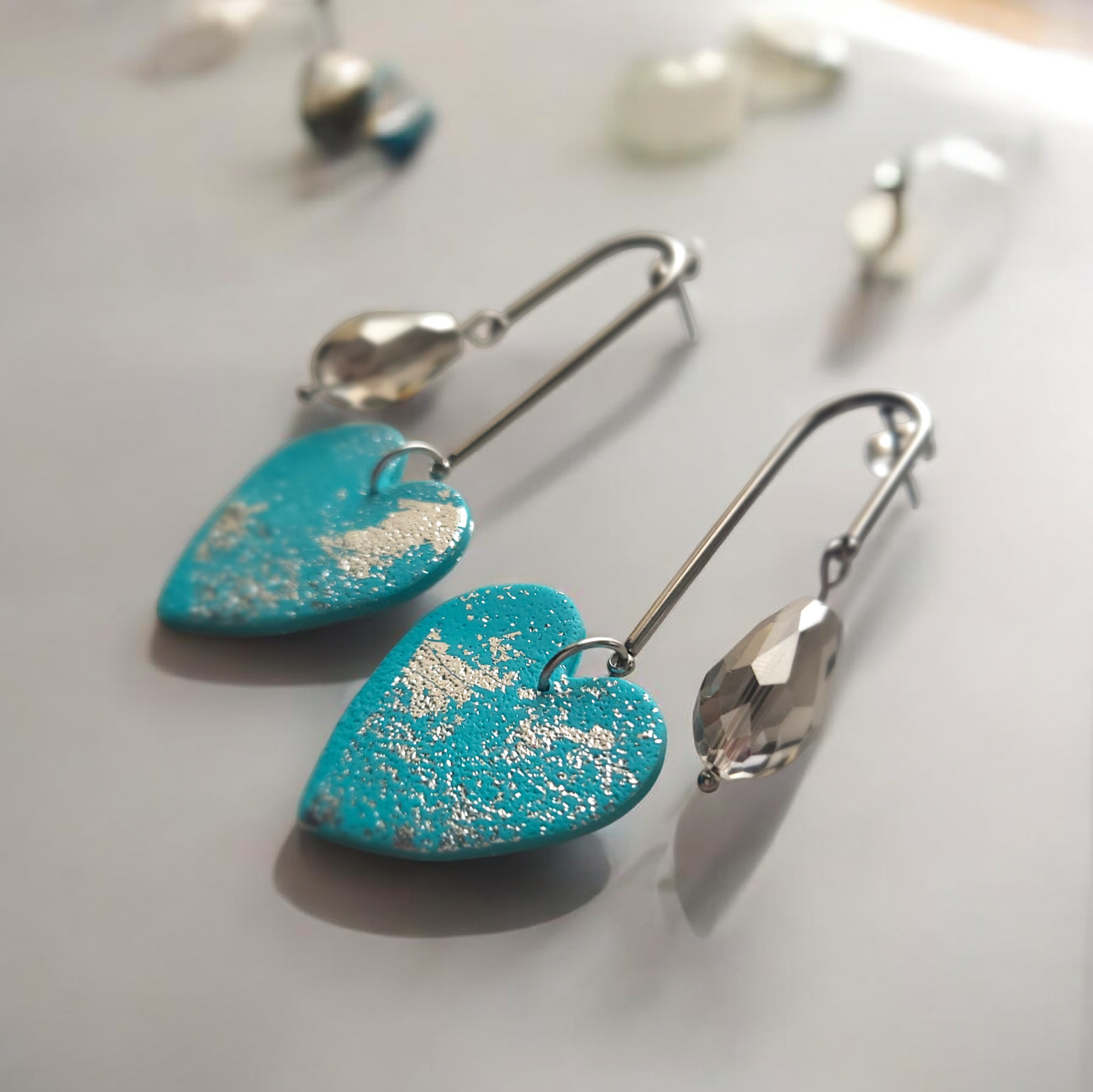 Inspiră-te din frumusețea naturii cu acești cercei handmade în formă de inimă turcoaz, modelați manual din lut polimeric și accentuați cu detalii aurii din oțel inoxidabil și cristale. Textura delicată și nuanța turcoaz oferă un aer feminin și fresh, perfect pentru a adăuga culoare oricărei ținute.