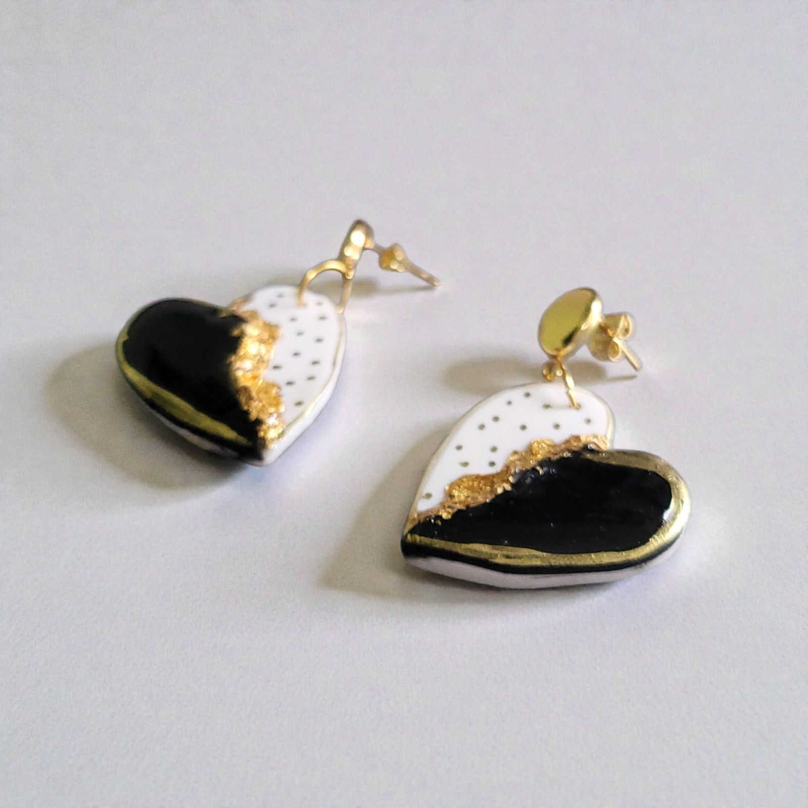 Cercei feminini și rafinați, realizați din elemente în formă de inimă jumatate albă cu buline aurii, jumătate neagră, imbracata in rasina. Designul lor modern, dar delicat, îi face potriviți atât pentru ținute elegante, cât și pentru apariții casual-chic. Sistemul de prindere asigură confort la purtare.