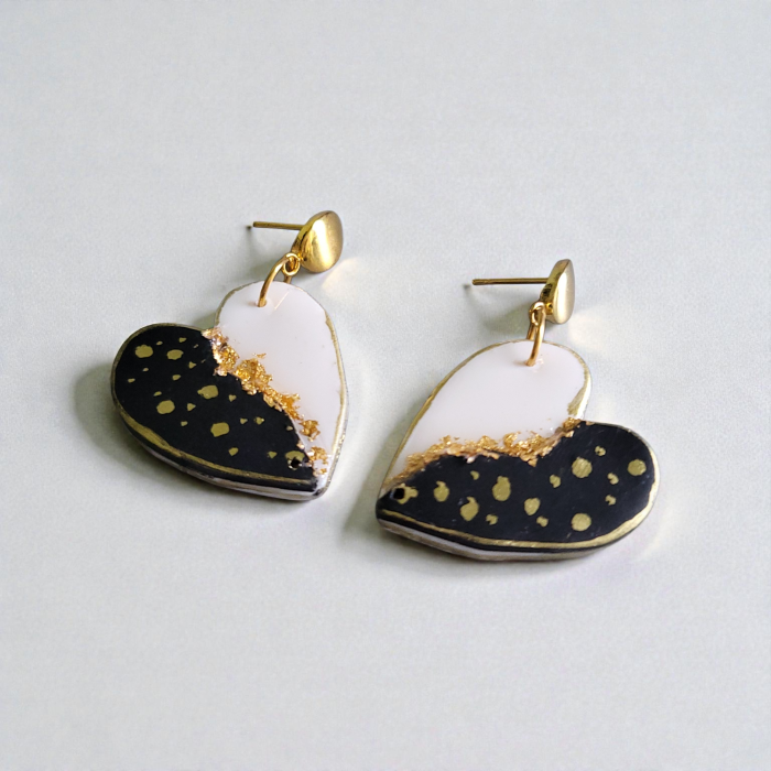 Cercei feminini și rafinați, realizați din elemente în formă de inimă jumatate neagra cu buline aurii, jumătate alba, imbracata in rasina. Designul lor modern, dar delicat, îi face potriviți atât pentru ținute elegante, cât și pentru apariții casual-chic. Sistemul de prindere asigură confort la purtare.