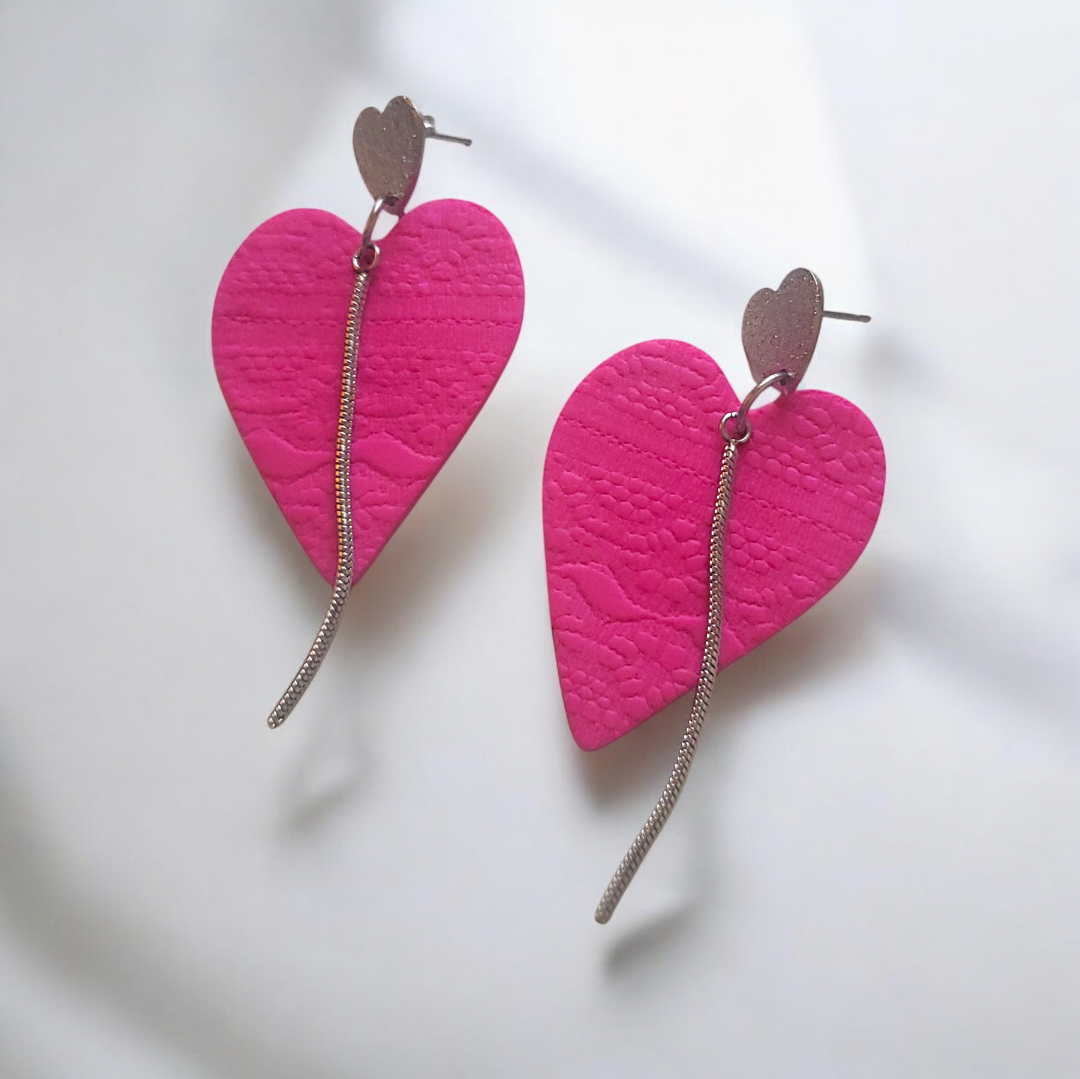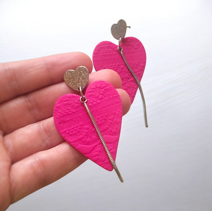 Cercei feminini și rafinați, realizați din elemente în formă de inimă cu accente argintii. Designul lor modern, dar delicat, îi face potriviți atât pentru ținute elegante, cât și pentru apariții casual-chic. Sistemul de prindere asigură confort la purtare, iar combinația de roz și argintiu oferă un contrast sofisticat și atemporal.