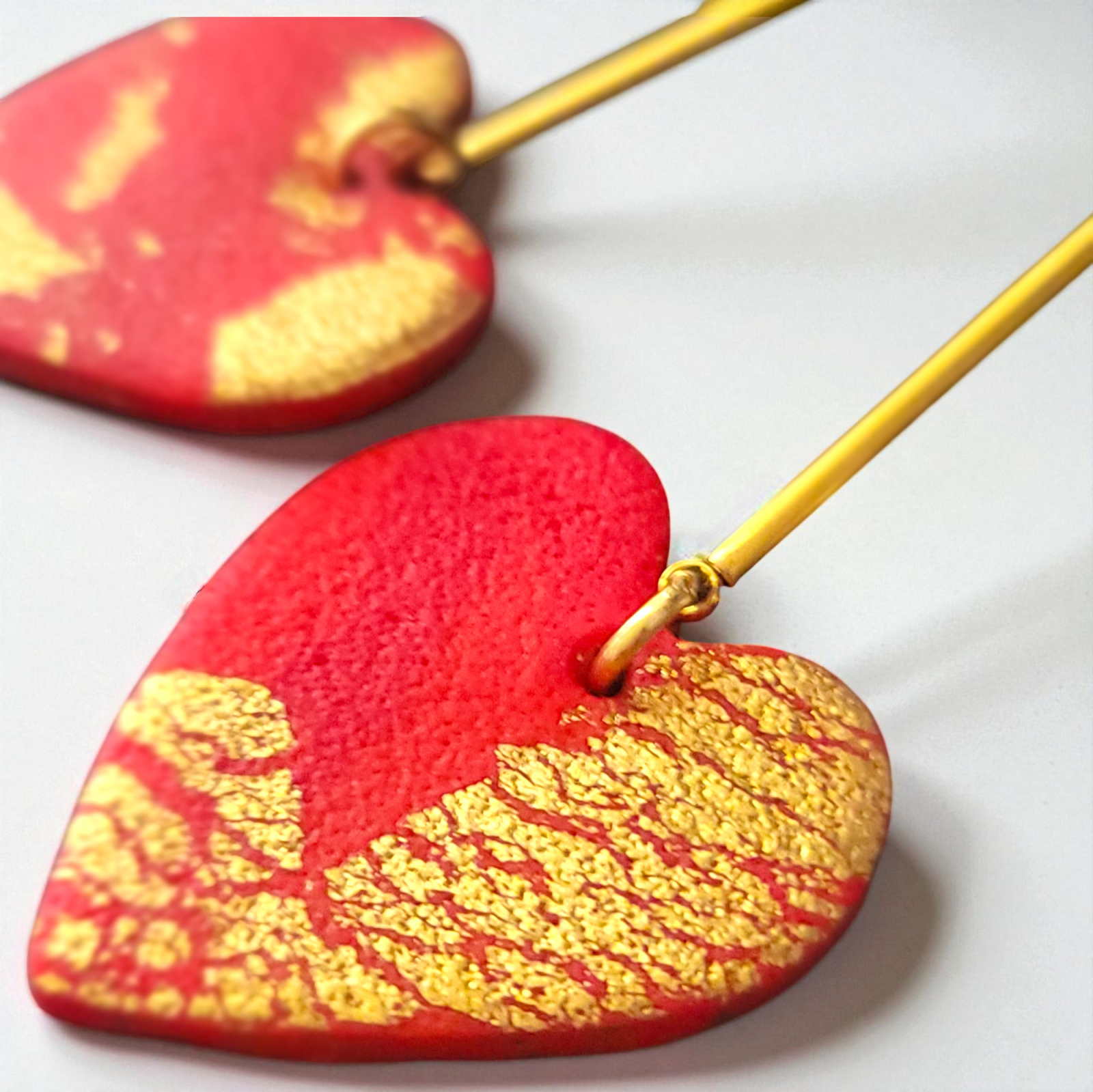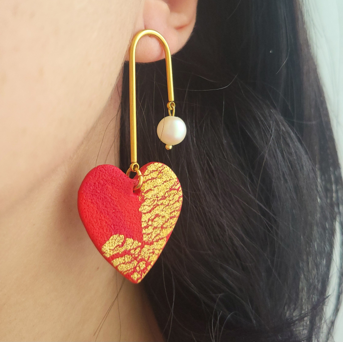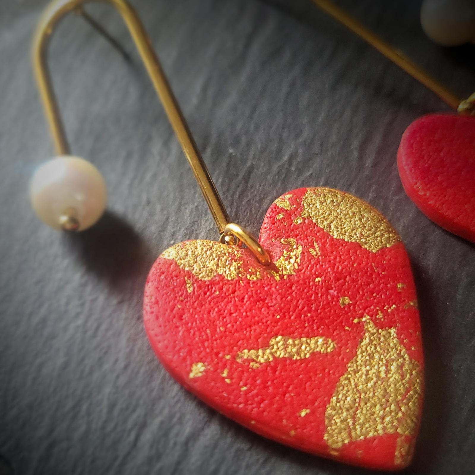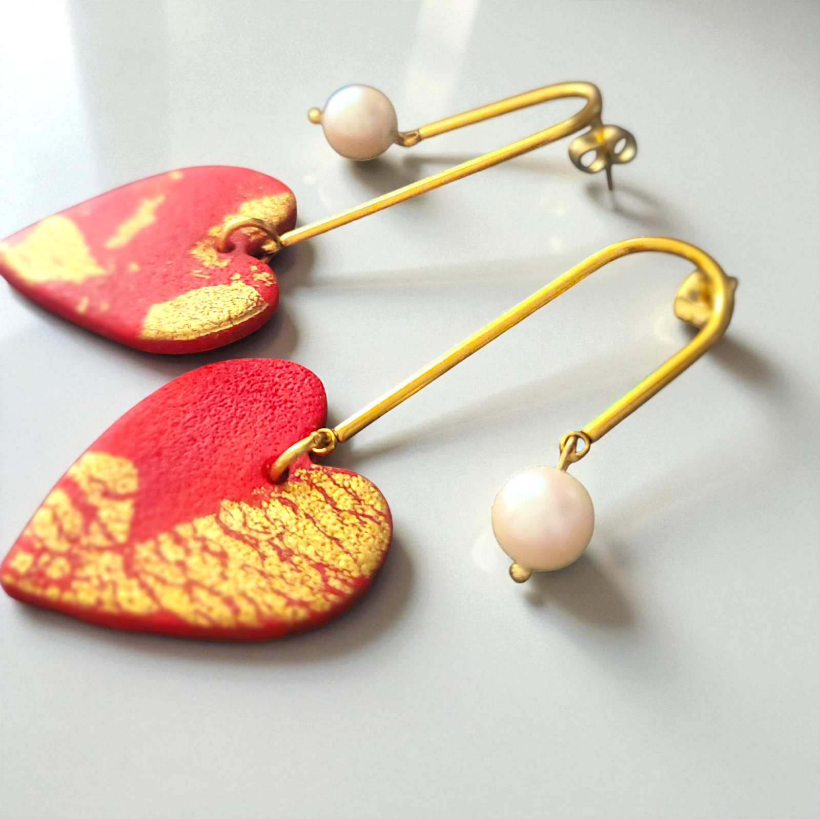 Inspiră-te din frumusețea naturii cu acești cercei handmade în formă de inimă roșie, modelați manual din lut polimeric și accentuați cu detalii aurii din oțel inoxidabil și perle. Textura delicată și nuanța intensă de roșu oferă un aer feminin și vibrant, perfect pentru a adăuga culoare oricărei ținute.
