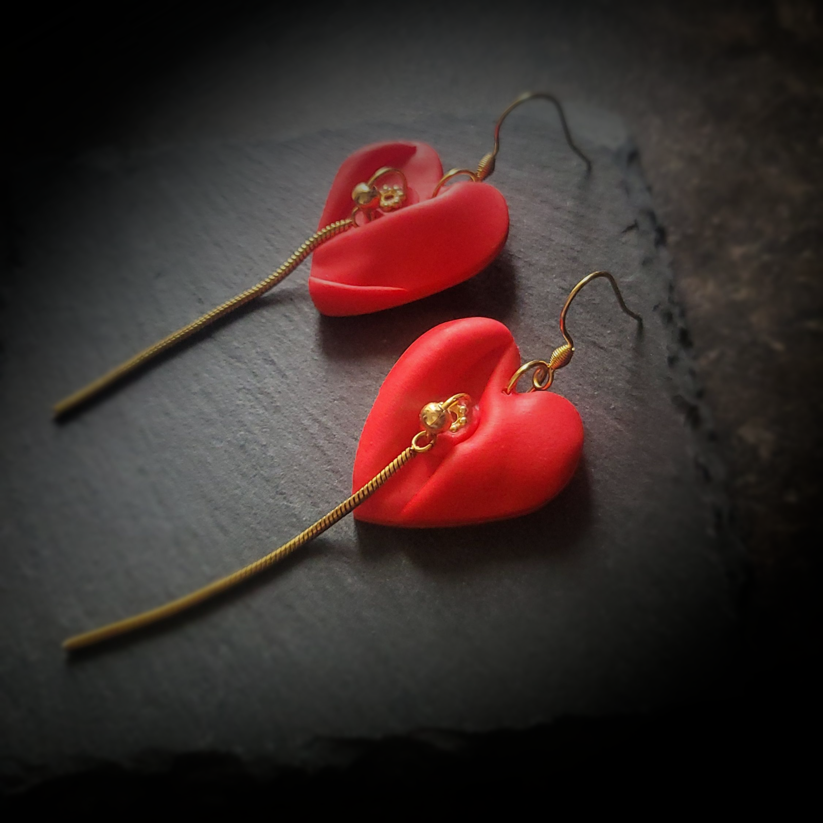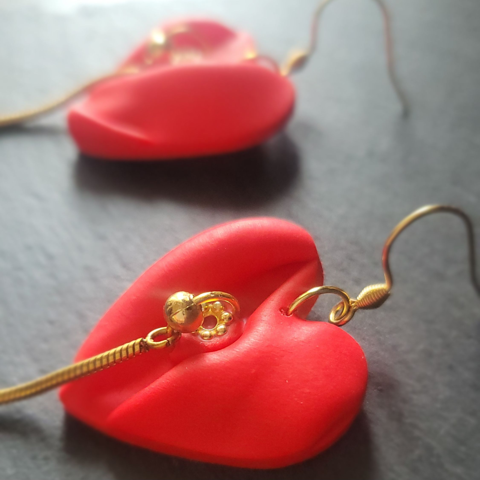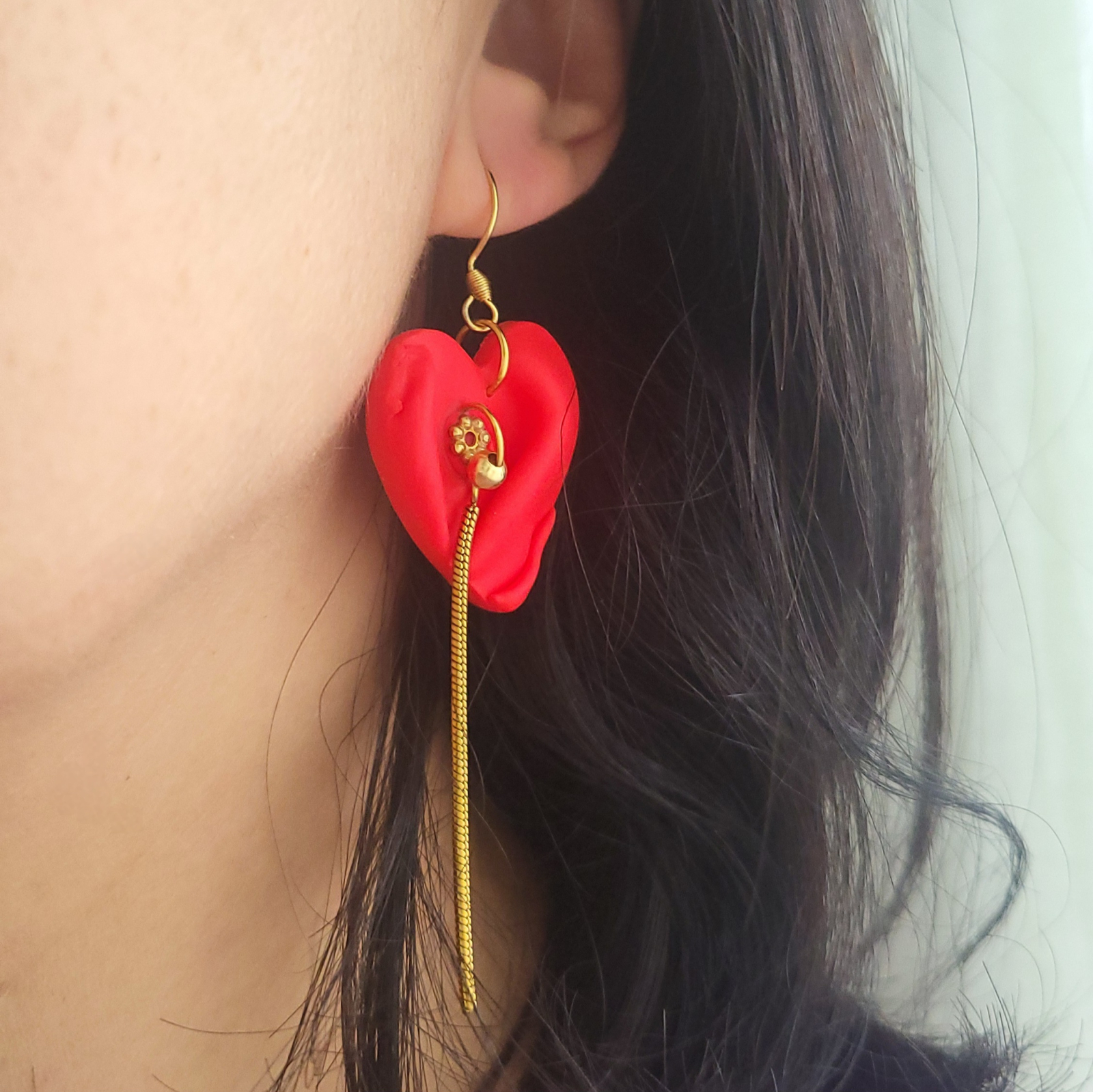 Adaugă o notă romantică ținutei tale cu acești cercei handmade în formă de inimă, realizați din lut polimeric  și accesorizați cu elemente fine din oțel inoxidabil auriu. Designul lor unic combină textura mată a inimioarei roșii cu un fir metalic elegant, pentru un efect delicat și sofisticat.
